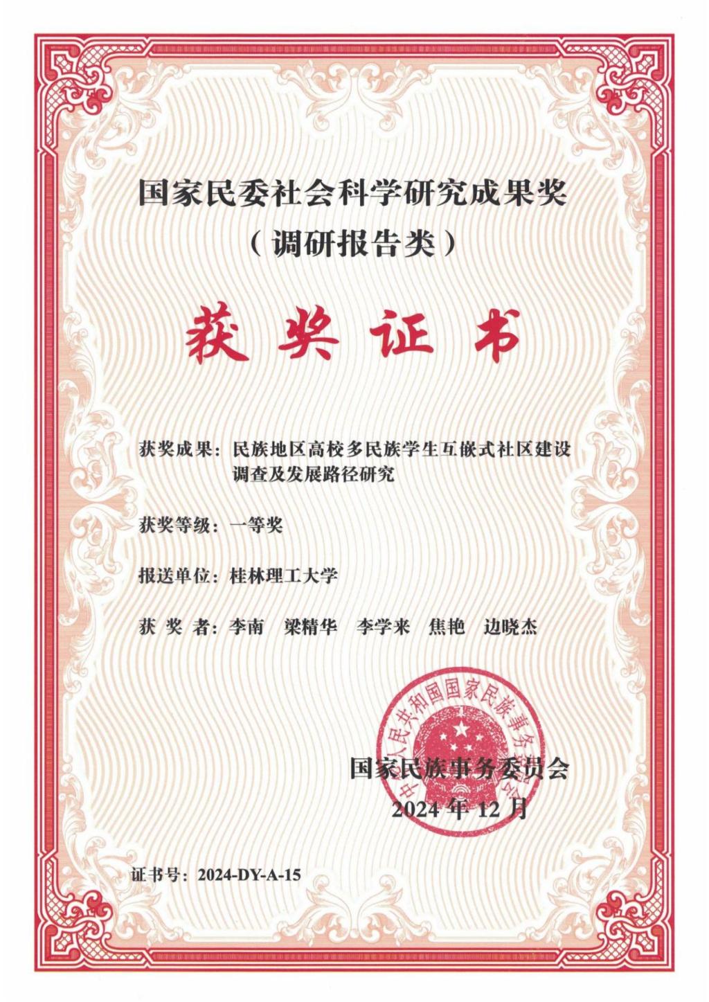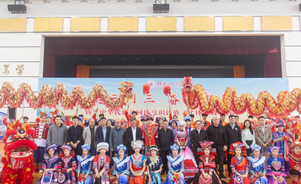 学校坚持党对民族工作的全面领导,出台《推进建设铸牢中华民族共同体意识示范校实施方案》等制度文件,建成民族团结园,开设《中华民族共同体概论》必修课等,系统谋划新时代民族工作。深入实施民族团结进步创建,常态化开展“民族团结进步宣传月”及广西“三月三”等特色品牌活动,累计覆盖各族师生近万人次,在常态化宣传教育中做好意识形态工作,引导师生不断增进“五个认同”,学校获评自治区第六批民族团结进步示范校,1人获评自治区民族团结进步模范个人,并积极助力桂林市创建全国民族团结进步示范市。充分发挥学科人才优势,为创建工作注入深厚内涵,李建卫老师创作的民族团结主题雕塑落成于象山公园,莫田娟老师作词作曲的《石榴籽之歌》荣获桂林市民族团结优秀原创歌曲。理论研究平台建设同步推进,挂牌成立桂林市铸牢中华民族共同体意识理论研究基地,组织专家学者开展相关研究,近5年获得民族类课题110余项、发布论文200余篇、出版专著7本,多项成果荣获国家民委社会科学研究成果奖、自治区民宗委政策理论创新奖、自治区民宗委优秀调研成果奖等,形成了实践与理论互促共进的生动局面。