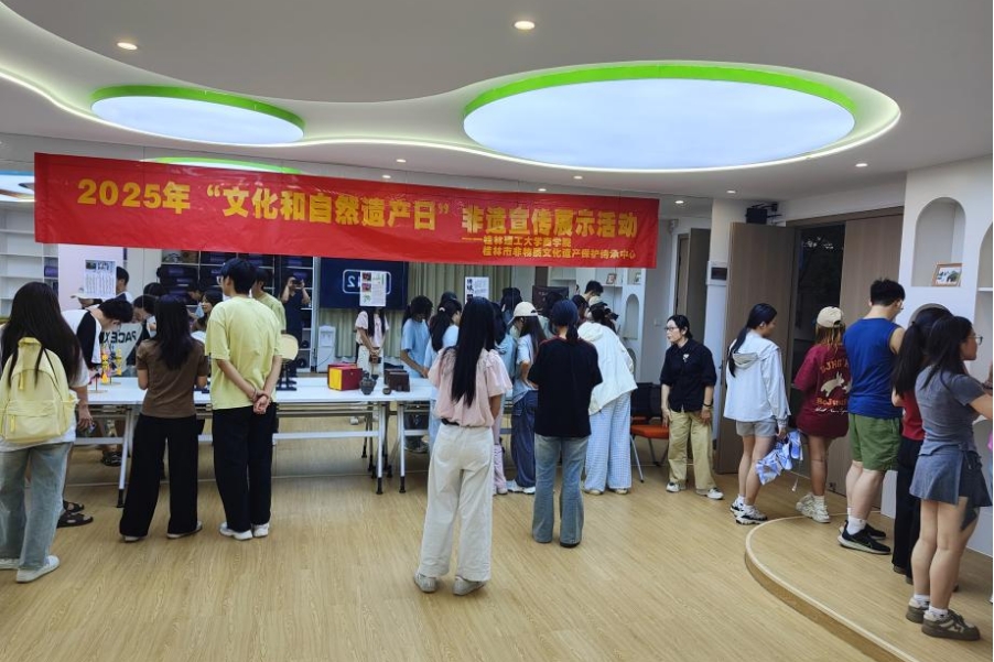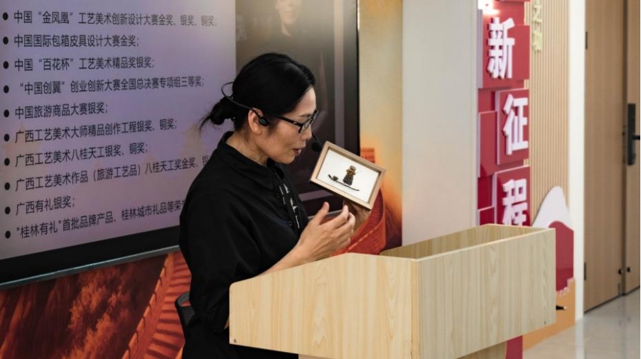 自治区级非遗传承人邓凤竹分享桂林石画技艺,讲述其以石画实现自我价值,创办残疾人就业工场并推动石画入选区级非遗的经历,其故事传递出的民族团结情怀令学子动容。现场展示了桂林石画、壮锦、钦州坭兴陶、靖西绣球等八类非遗产品。